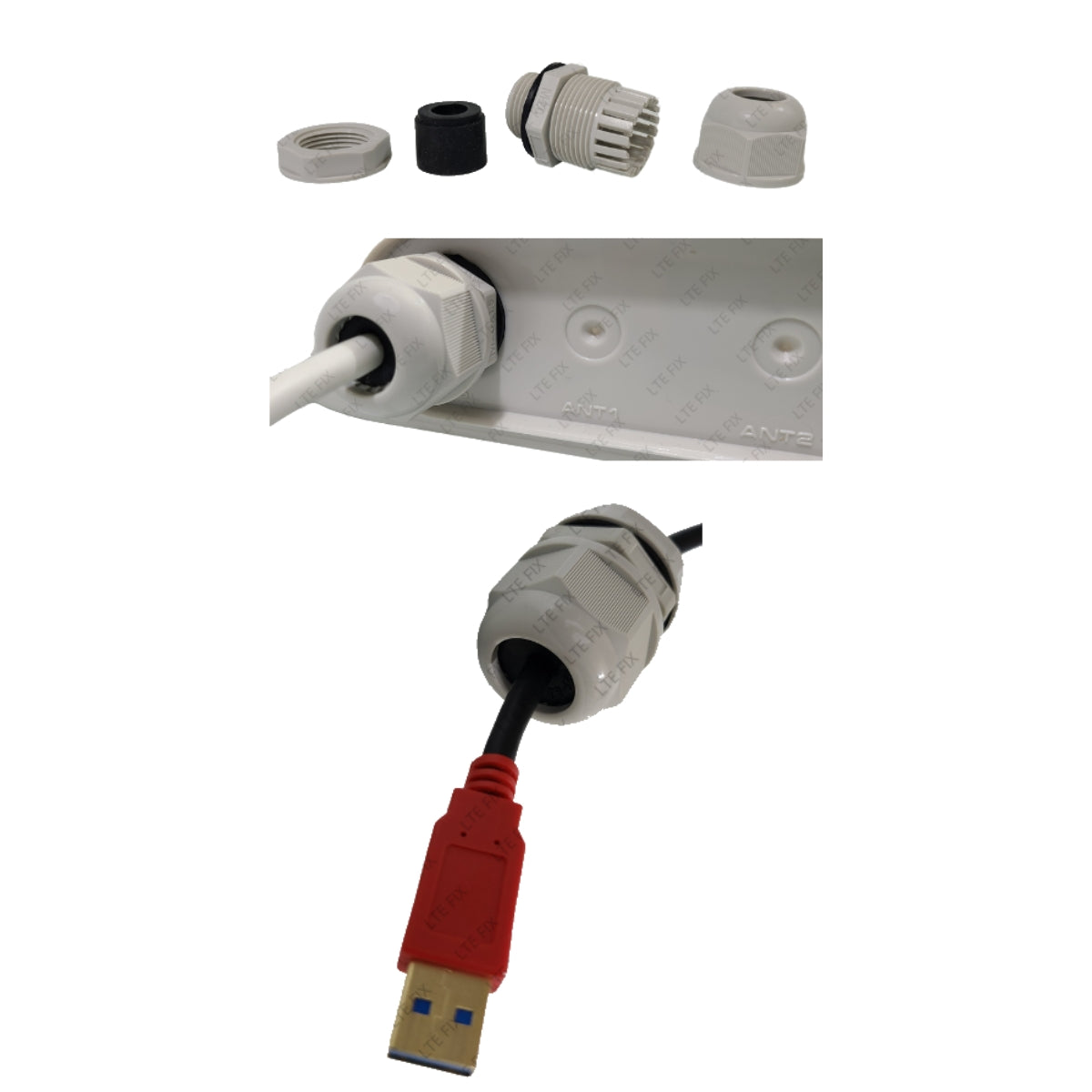 With an overall inside diameter bore of ~3/4" (19mm) there is plenty of space to pass through a standard size RJ45 ethernet plug, a some antenna cable connectors and even a USB plug. The included soft rubber gland is split to fit over your ethernet cable, USB cable, antenna cabling, or any wiring you wish to install through your outdoor enclosure for direct wiring to your cellular, or wifi, equipment. Typical installation use is for ethernet, USB, and antenna cabling, though power cabling and any other cabling you can squeeze though will be sealed.